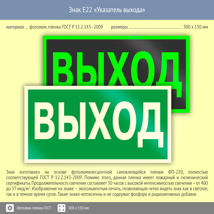 Знак E22 «Указатель выхода» (фотолюминесцентная пленка ГОСТ 34428-2018, 300х150 мм) в Курске купить