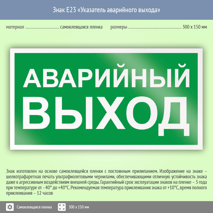 Знак E23 «Указатель аварийного выхода» (пленка, 300х150 мм) в Курске купить