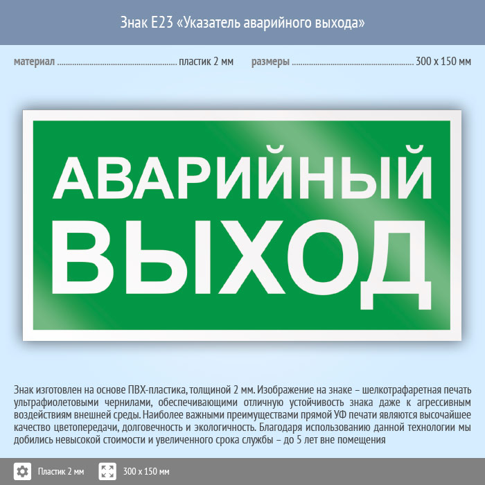 Знак E23 «Указатель аварийного выхода» (пластик, 300х150 мм) в Курске купить