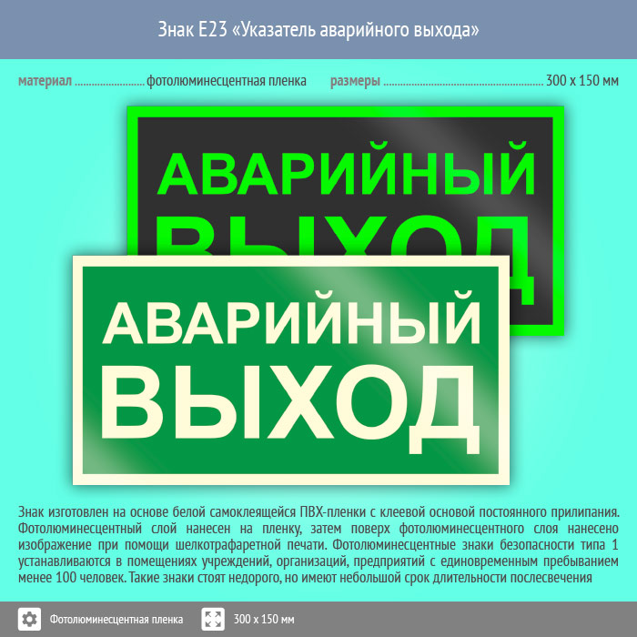 Знак E23 «Указатель аварийного выхода» (фотолюминесцентная пленка, 300х150 мм) в Курске купить