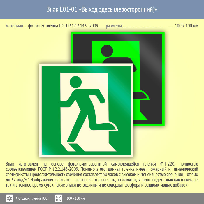Знак E01-01 «Выход здесь (левосторонний)» (фотолюминесцентная пленка ГОСТ 34428-2018, 100х100 мм) в Курске купить