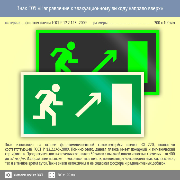 Знак E05 «Направление к эвакуационному выходу направо вверх» (фотолюминесцентная пленка ГОСТ 34428-2018, 200х100 мм) в Курске купить