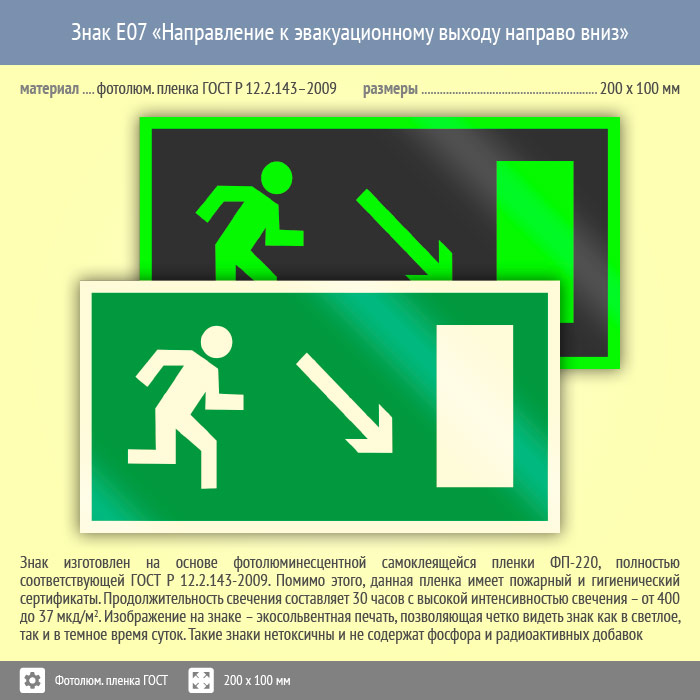 Знак E07 «Направление к эвакуационному выходу направо вниз» (фотолюминесцентная пленка ГОСТ 34428-2018, 200х100 мм) в Курске купить