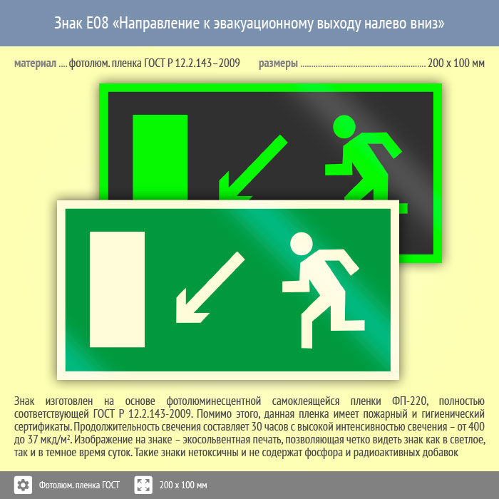 Знак E08 «Направление к эвакуационному выходу налево вниз» (фотолюминесцентная пленка ГОСТ 34428-2018, 200х100 мм) в Курске купить