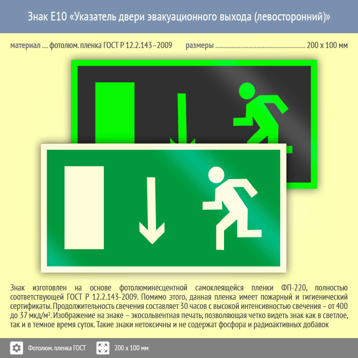 Знак E10 «Указатель двери эвакуационного выхода (левосторонний)» (фотолюминесцентная пленка ГОСТ 34428-2018, 200х100 мм) в Курске купить