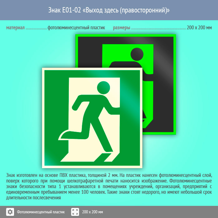 Знак E01-02 «Выход здесь (правосторонний)» (фотолюминесцентный пластик, 200х200 мм) в Курске купить