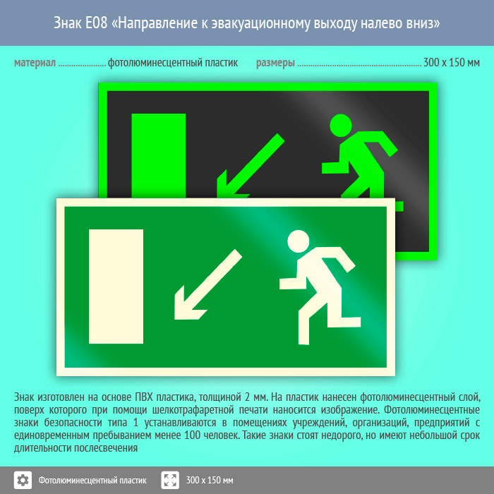 Знак E08 «Направление к эвакуационному выходу налево вниз» (фотолюминесцентный пластик, 300х150 мм) в Курске купить