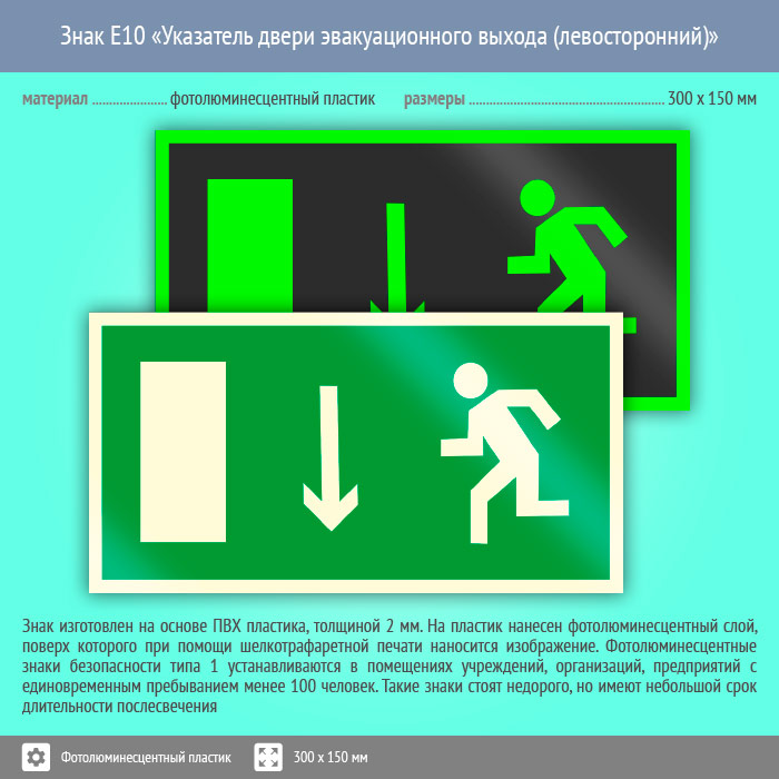 Знак E10 «Указатель двери эвакуационного выхода (левосторонний)» (фотолюминесцентный пластик, 300х150 мм) в Курске купить
