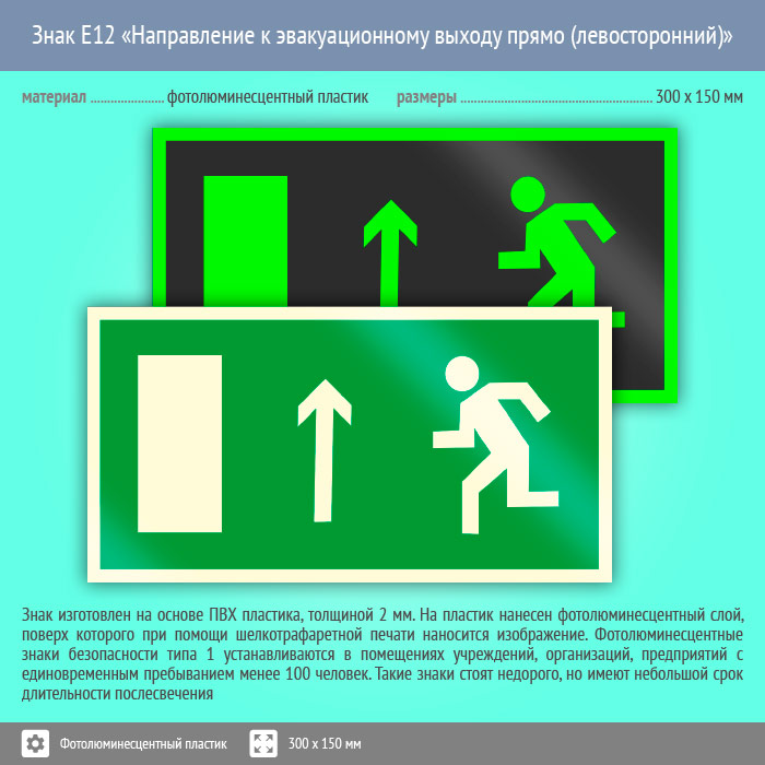 Знак E12 «Направление к эвакуационному выходу прямо (левосторонний)» (фотолюминесцентный пластик, 300х150 мм) в Курске купить
