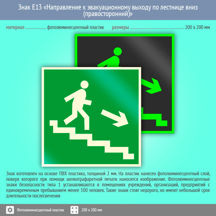 Знак E13 «Направление к эвакуационному выходу по лестнице вниз (правосторонний)» (фотолюминесцентный пластик, 200х200 мм) в Курске купить