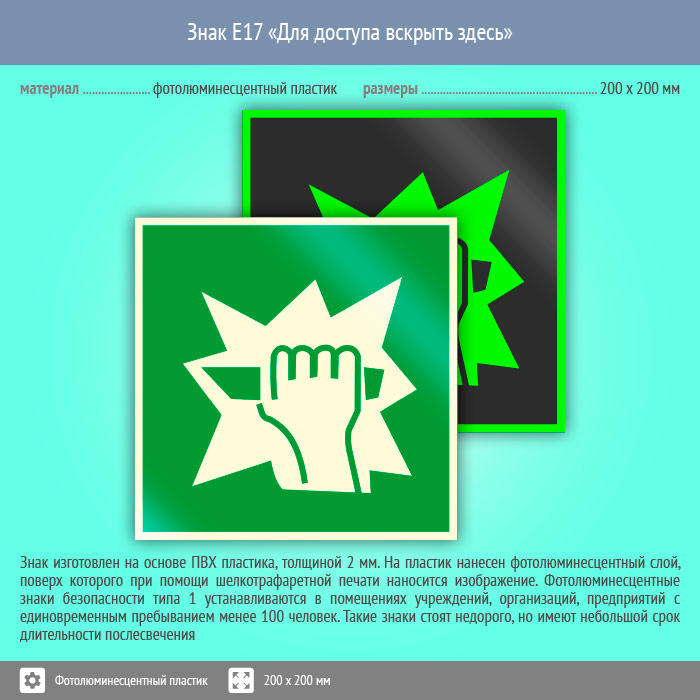 Знак E17 «Для доступа вскрыть здесь» (фотолюминесцентный пластик, 200х200 мм) в Курске купить
