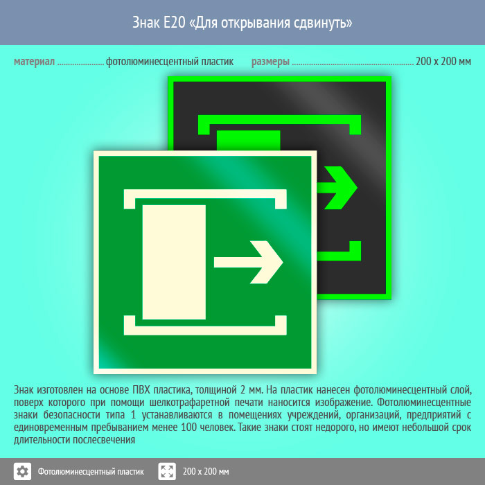 Знак E20 «Для открывания сдвинуть» (фотолюминесцентный пластик, 200х200 мм) в Курске купить