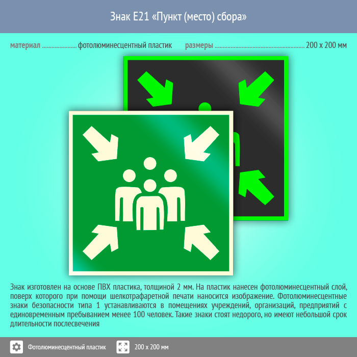 Знак E21 «Пункт (место) сбора» (фотолюминесцентный пластик, 200х200 мм) в Курске купить