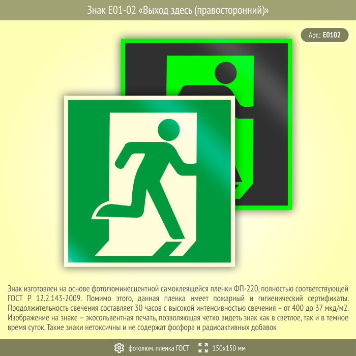 Знак E01-02 «Выход здесь (правосторонний)» (фотолюминесцентная пленка ГОСТ 34428-2018, 150х150 мм) в Курске купить