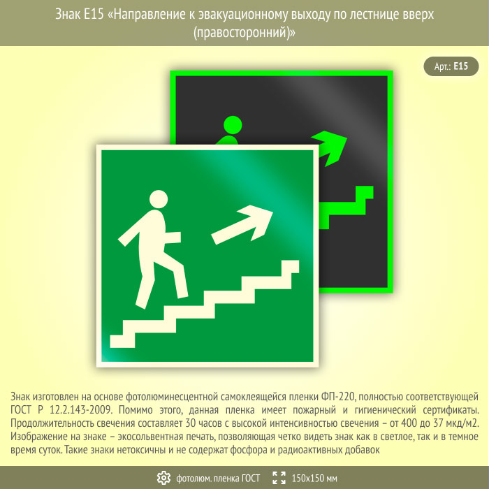 Знак E15 «Направление к эвакуационному выходу по лестнице вверх (правосторонний)» (фотолюминесцентная пленка ГОСТ 34428-2018, 150х150 мм) в Курске купить