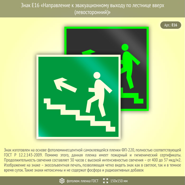 Знак E16 «Направление к эвакуационному выходу по лестнице вверх (левосторонний)» (фотолюминесцентная пленка ГОСТ 34428-2018, 150х150 мм) в Курске купить