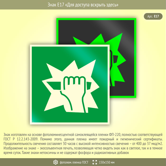 Знак E17 «Для доступа вскрыть здесь» (фотолюминесцентная пленка ГОСТ 34428-2018, 150х150 мм) в Курске купить