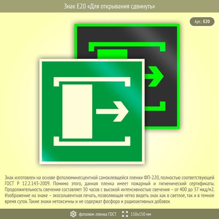 Знак E20 «Для открывания сдвинуть» (фотолюминесцентная пленка ГОСТ 34428-2018, 150х150 мм) в Курске купить