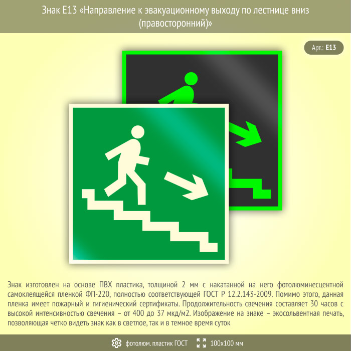 Знак E13 «Направление к эвакуационному выходу по лестнице вниз (правосторонний)» (фотолюминесцентный пластик ГОСТ 34428-2018, 100х100 мм) в Курске купить