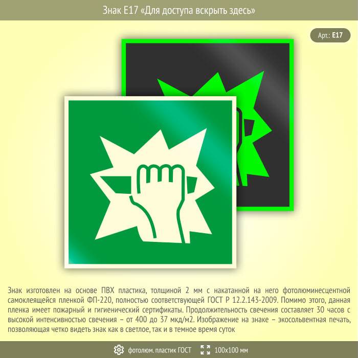 Знак E17 «Для доступа вскрыть здесь» (фотолюминесцентный пластик ГОСТ 34428-2018, 100х100 мм) в Курске купить