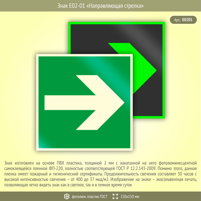 Знак E02-01 «Направляющая стрелка» (фотолюминесцентный пластик ГОСТ 34428-2018, 150х150 мм) в Курске купить