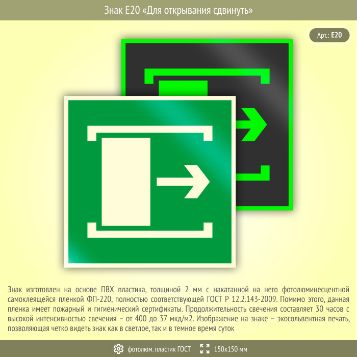 Знак E20 «Для открывания сдвинуть» (фотолюминесцентный пластик ГОСТ 34428-2018, 150х150 мм) в Курске купить