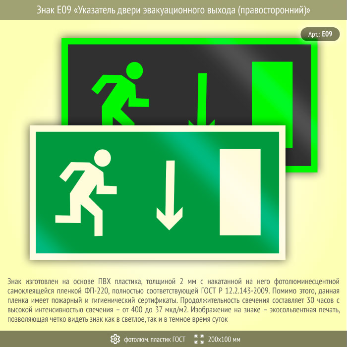 Знак E09 «Указатель двери эвакуационного выхода (правосторонний)» (фотолюминесцентный пластик ГОСТ 34428-2018, 200х100 мм) в Курске купить