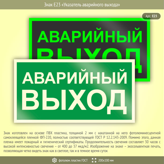 Знак E23 «Указатель аварийного выхода» (фотолюминесцентный пластик ГОСТ 34428-2018, 200х100 мм) в Курске купить