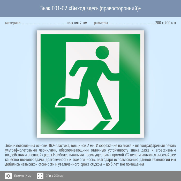 Знак E01-02 «Выход здесь (правосторонний)» (пластик, 200х200 мм) в Курске купить