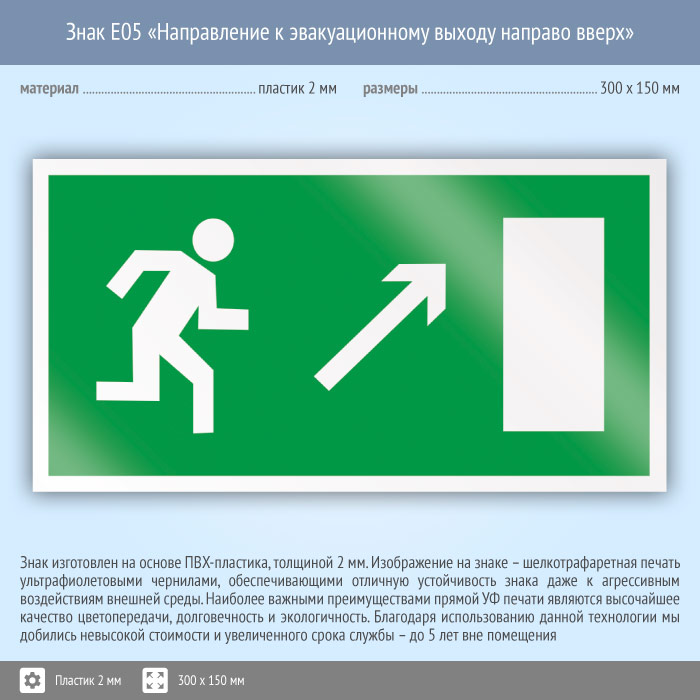 Знак E05 «Направление к эвакуационному выходу направо вверх» (пластик, 300х150 мм) в Курске купить