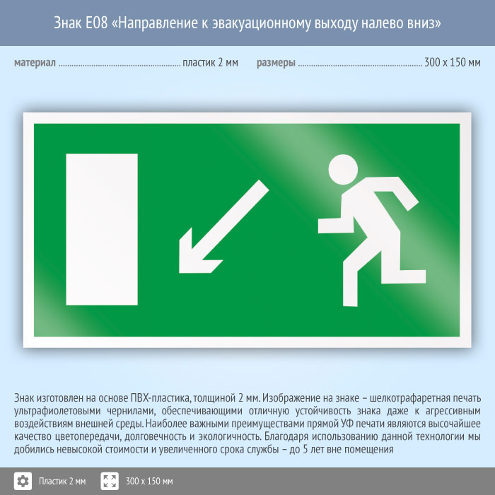 Знак E08 «Направление к эвакуационному выходу налево вниз» (пластик, 300х150 мм) в Курске купить