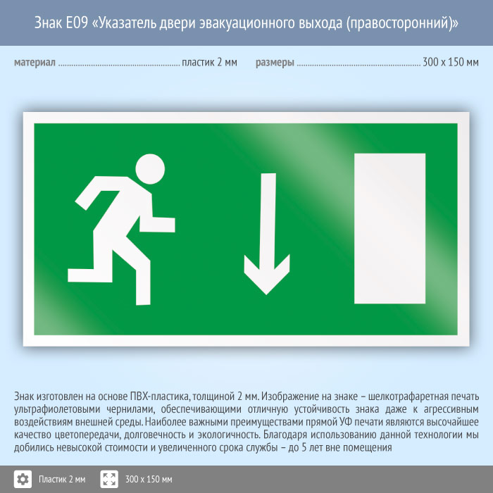 Знак E09 «Указатель двери эвакуационного выхода (правосторонний)» (пластик, 300х150 мм) в Курске купить