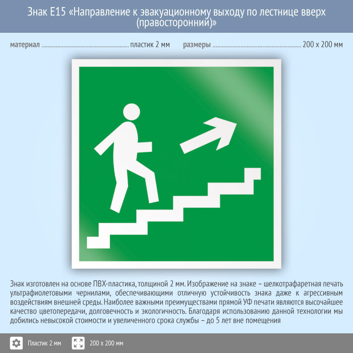 Знак E15 «Направление к эвакуационному выходу по лестнице вверх (правосторонний)» (пластик, 200х200 мм) в Курске купить
