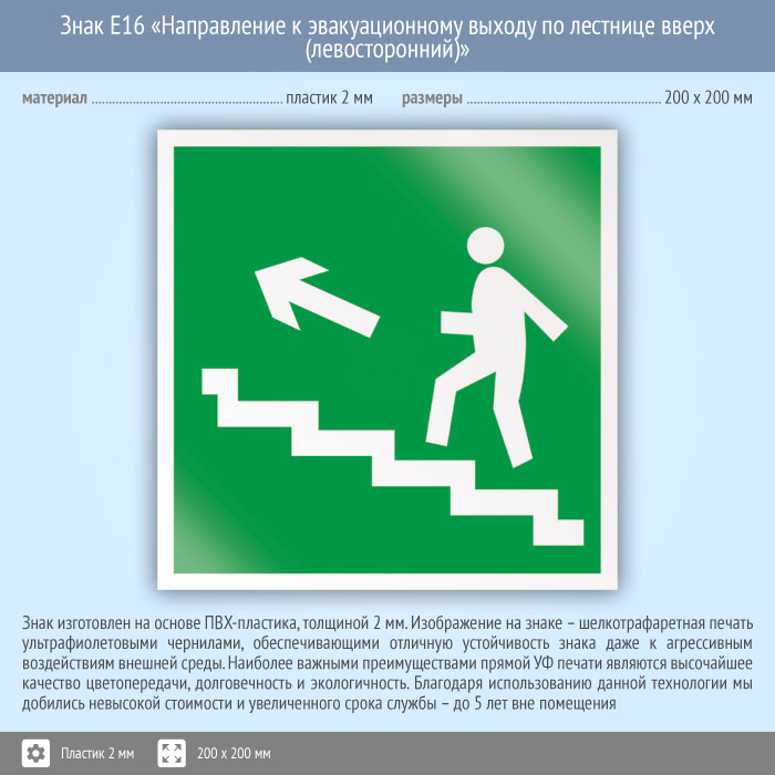 Знак E16 «Направление к эвакуационному выходу по лестнице вверх (левосторонний)» (пластик, 200х200 мм) в Курске купить