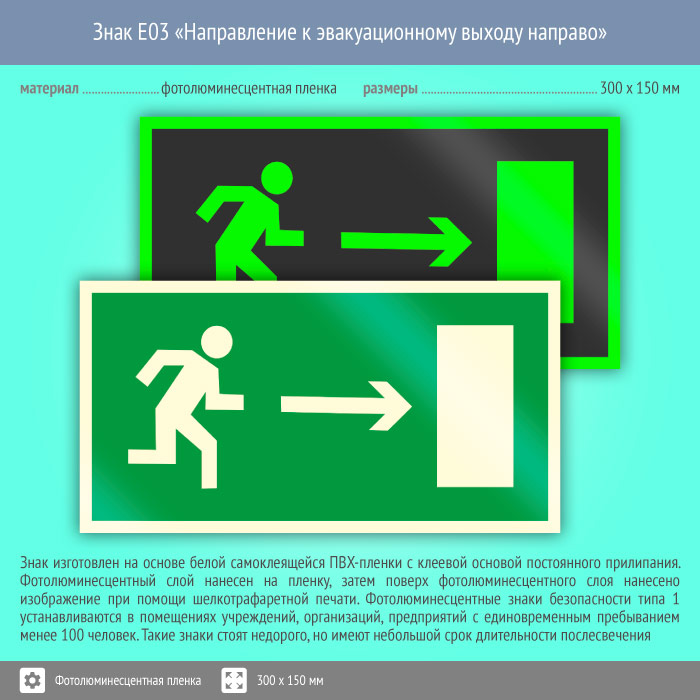 Знак E03 «Направление к эвакуационному выходу направо» (фотолюминесцентная пленка, 300х150 мм) в Курске купить