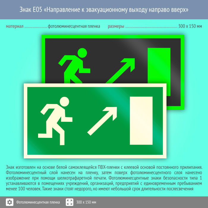 Знак E05 «Направление к эвакуационному выходу направо вверх» (фотолюминесцентная пленка, 300х150 мм) в Курске купить