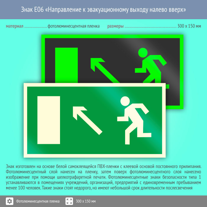 Знак E06 «Направление к эвакуационному выходу налево вверх» (фотолюминесцентная пленка, 300х150 мм) в Курске купить