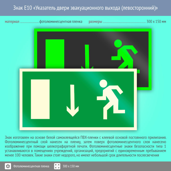 Знак E10 «Указатель двери эвакуационного выхода (левосторонний)» (фотолюминесцентная пленка, 300х150 мм) в Курске купить