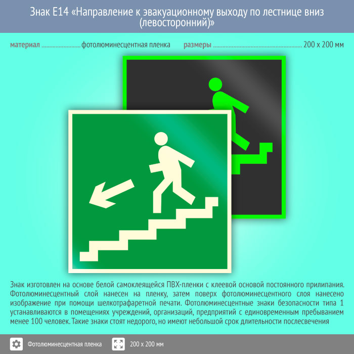 Знак E14 «Направление к эвакуационному выходу по лестнице вниз (левосторонний)» (фотолюминесцентная пленка, 200х200 мм) в Курске купить