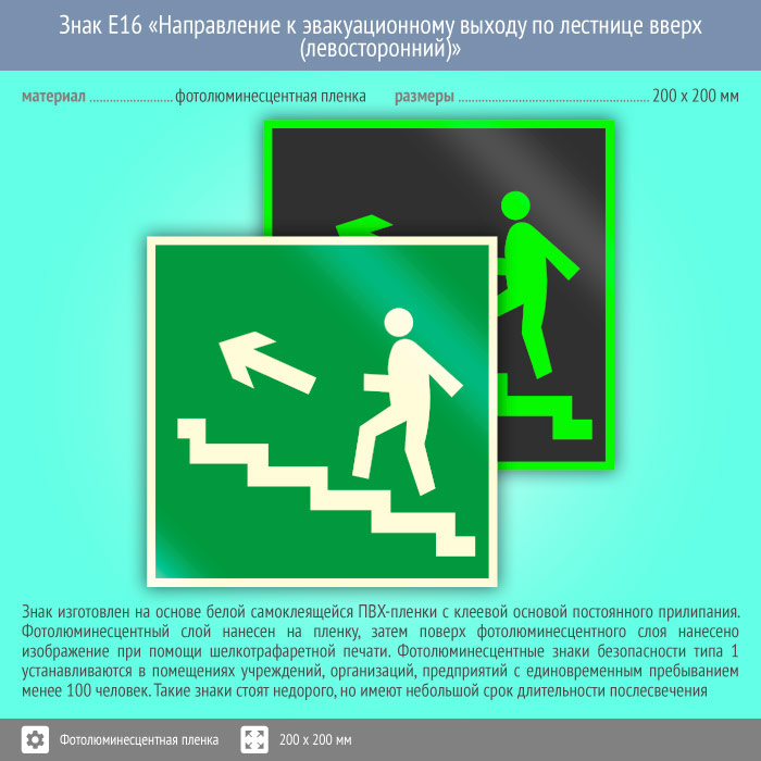 Знак E16 «Направление к эвакуационному выходу по лестнице вверх (левосторонний)» (фотолюминесцентная пленка, 200х200 мм) в Курске купить