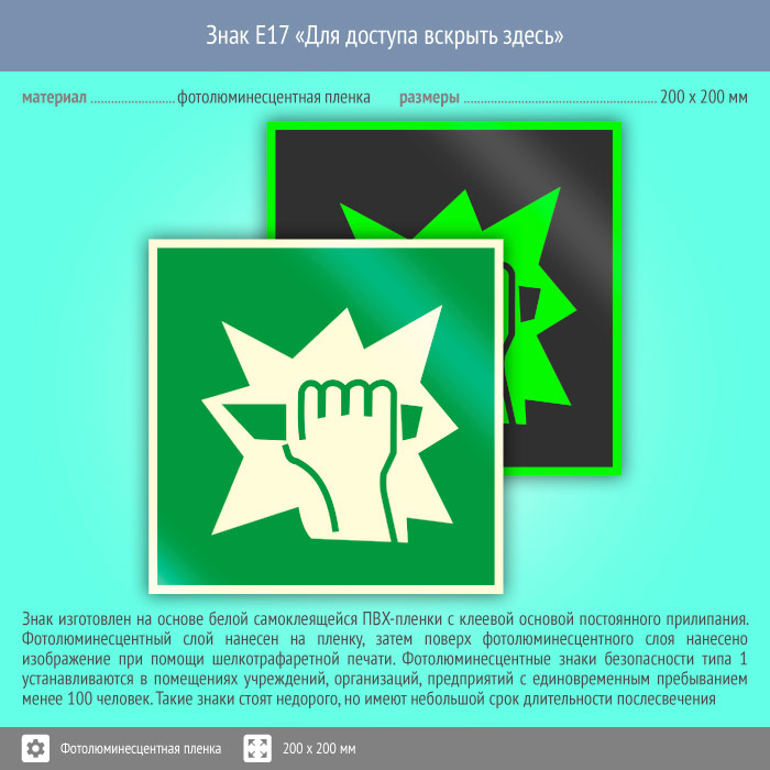 Знак E17 «Для доступа вскрыть здесь» (фотолюминесцентная пленка, 200х200 мм) в Курске купить