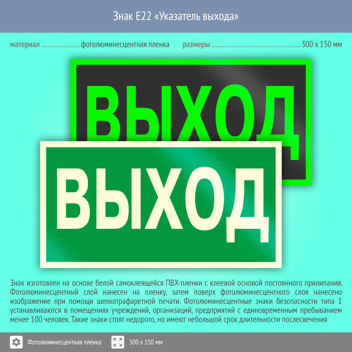 Знак E22 «Указатель выхода» (фотолюминесцентная пленка, 300х150 мм) в Курске купить
