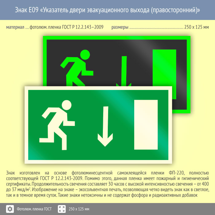 Знак E09 «Указатель двери эвакуационного выхода (правосторонний)» (фотолюминесцентная пленка ГОСТ 34428-2018, 250х125 мм) в Курске купить