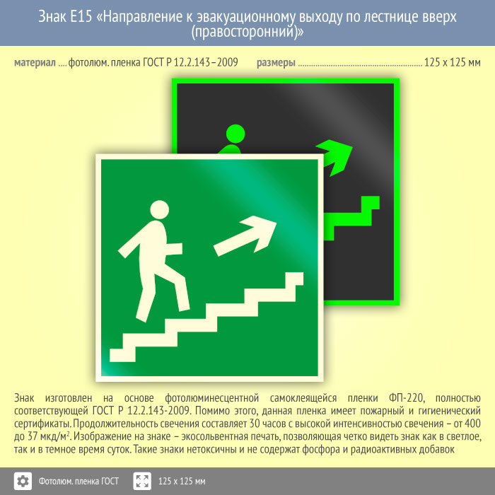 Знак E15 «Направление к эвакуационному выходу по лестнице вверх (правосторонний)» (фотолюминесцентная пленка ГОСТ 34428-2018, 125х125 мм) в Курске купить