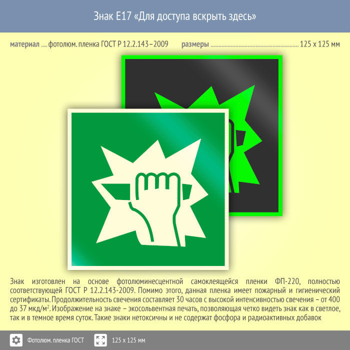 Знак E17 «Для доступа вскрыть здесь» (фотолюминесцентная пленка ГОСТ 34428-2018, 125х125 мм) в Курске купить