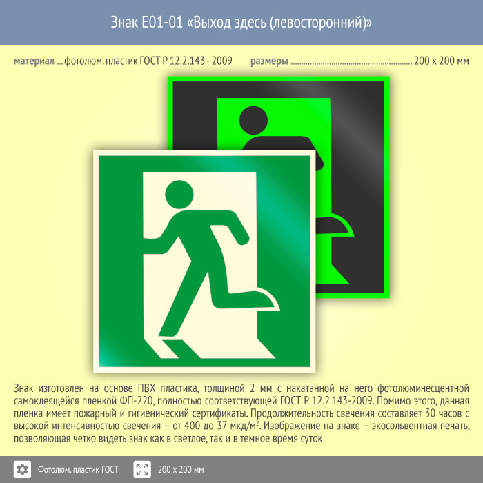 Знак E01-01 «Выход здесь (левосторонний)» (фотолюминесцентный пластик ГОСТ 34428-2018, 200х200 мм) в Курске купить