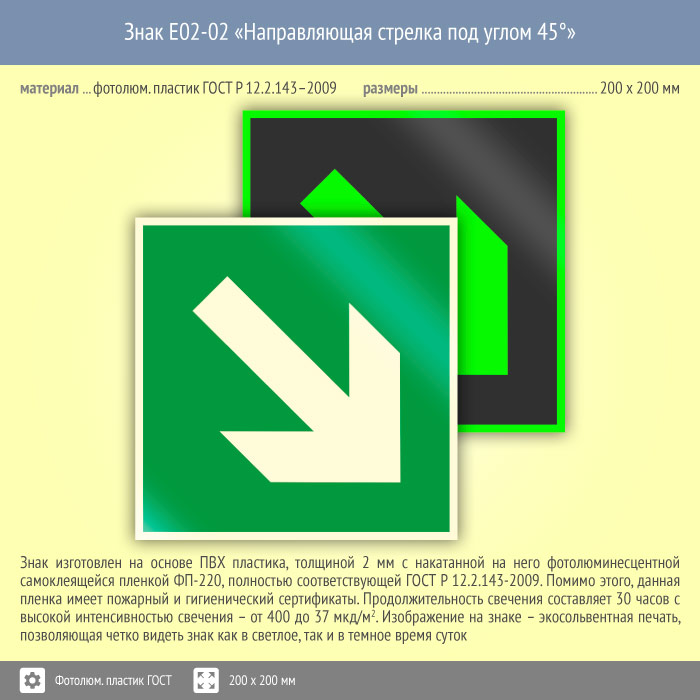 Знак E02-02 «Направляющая стрелка под углом 45°» (фотолюминесцентный пластик ГОСТ 34428-2018, 200х200 мм) в Курске купить