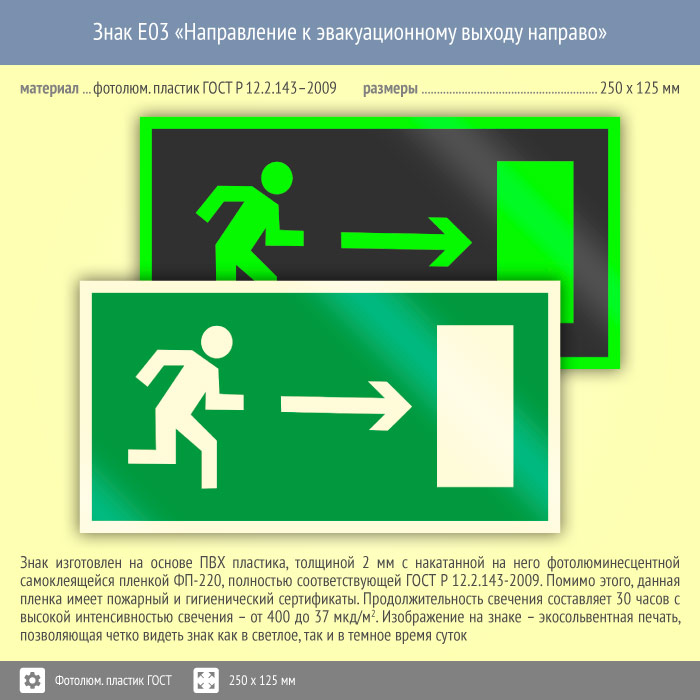 Знак E03 «Направление к эвакуационному выходу направо» (фотолюминесцентный пластик ГОСТ 34428-2018, 250х125 мм) в Курске купить