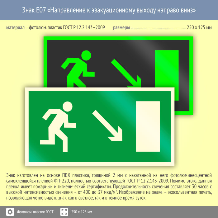 Знак E07 «Направление к эвакуационному выходу направо вниз» (фотолюминесцентный пластик ГОСТ 34428-2018, 250х125 мм) в Курске купить