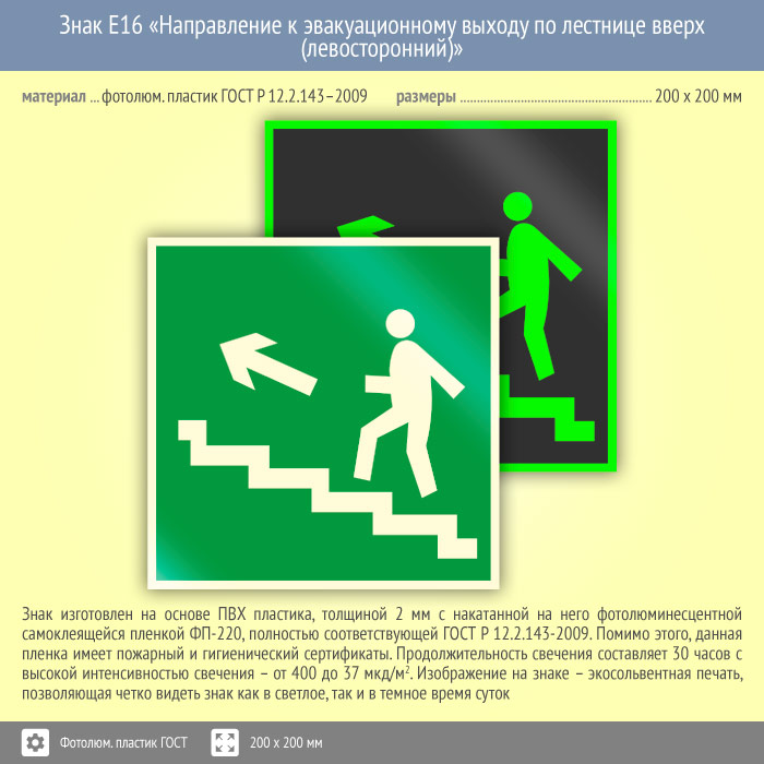 Знак E16 «Направление к эвакуационному выходу по лестнице вверх (левосторонний)» (фотолюминесцентный пластик ГОСТ 34428-2018, 200х200 мм) в Курске купить